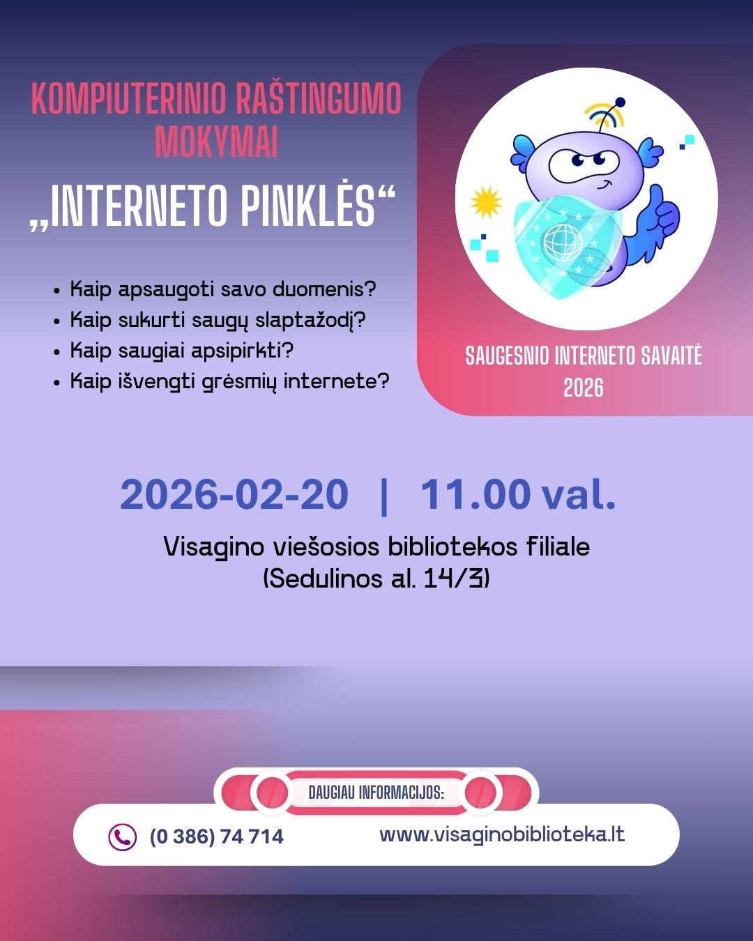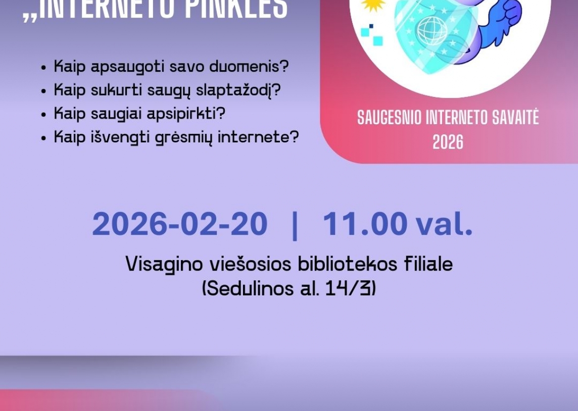 Kviečiame į kompiuterinio raštingumo mokymus „Interneto pinklės“, skirtus Saugesnio interneto dienai (SID) pažymėti, kurie vyks š. m. vasario 20 d., 11.00 val. Visagino viešosios bibliotekos filiale (Sedulinos al. 14/3).
