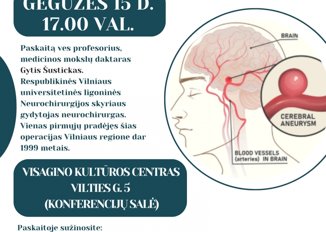 2026 m. gegužės 15 d. 17.00 val. organizuojama nemokama paskaita „Galvos smegenų arterijos aneurizma – ar žinote, kaip ją atpažinti laiku?“, kuri vyks Visagino kultūros centre (Konferencijų salė, VKC „Sedulina“, Vilties g. 5, Visaginas).