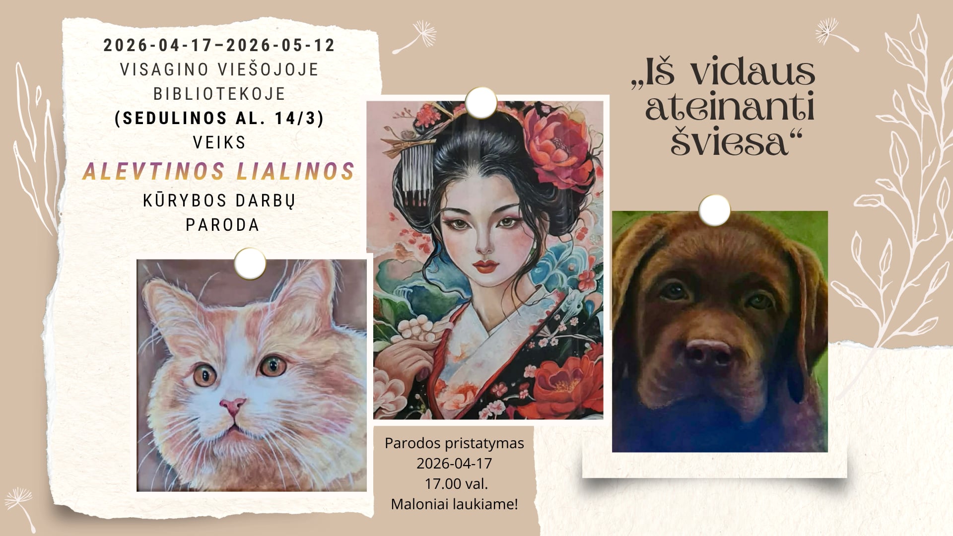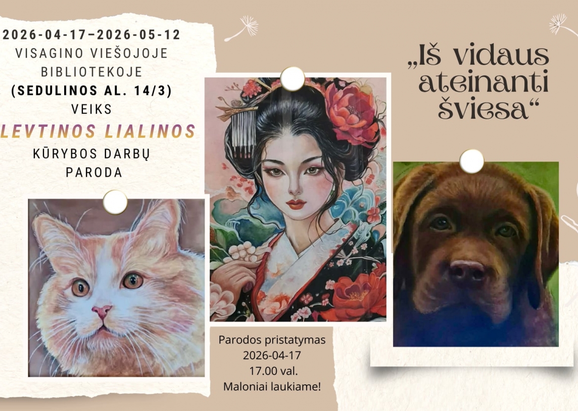 2026 m. balandžio 17 d. – gegužės 12 d. Visagino viešojoje bibliotekoje (Sedulinos al. 14/3) veiks visaginietės Alevtinos Lialinos kūrybos darbų paroda „Iš vidaus ateinanti šviesa“. Tai jautri ir įkvepianti ekspozicija, kviečianti trumpam atsitraukti nuo kasdienio skubėjimo ir pažvelgti į save bei supantį pasaulį kitaip.