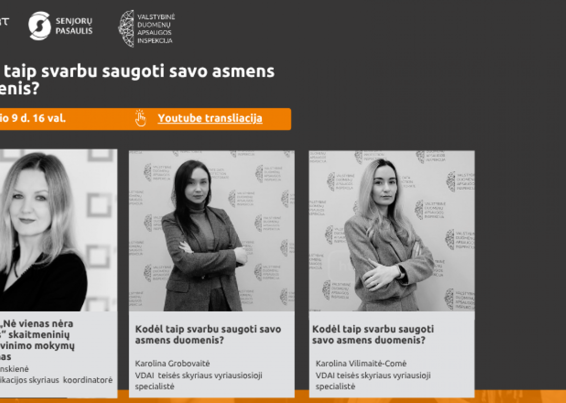 Paskaitoje „Kodėl taip svarbu saugoti savo asmens duomenis?” Valstybinės duomenų apsaugos inspekcijos teisės skyriaus vyriausiosios specialistės Karolina Grobovaitė ir Karolina Vilimaitė-Comė pasakos: