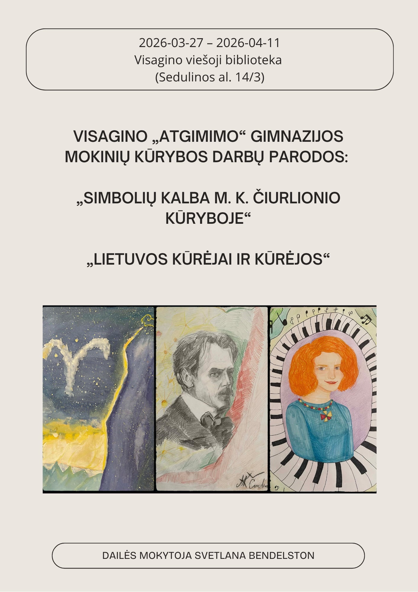 2026 m. kovo 27 d. – balandžio 11 d. Visagino viešojoje bibliotekoje (Sedulinos al. 14/3) kviečiame apsilankyti Visagino „Atgimimo“ gimnazijos mokinių kūrybos darbų parodose.