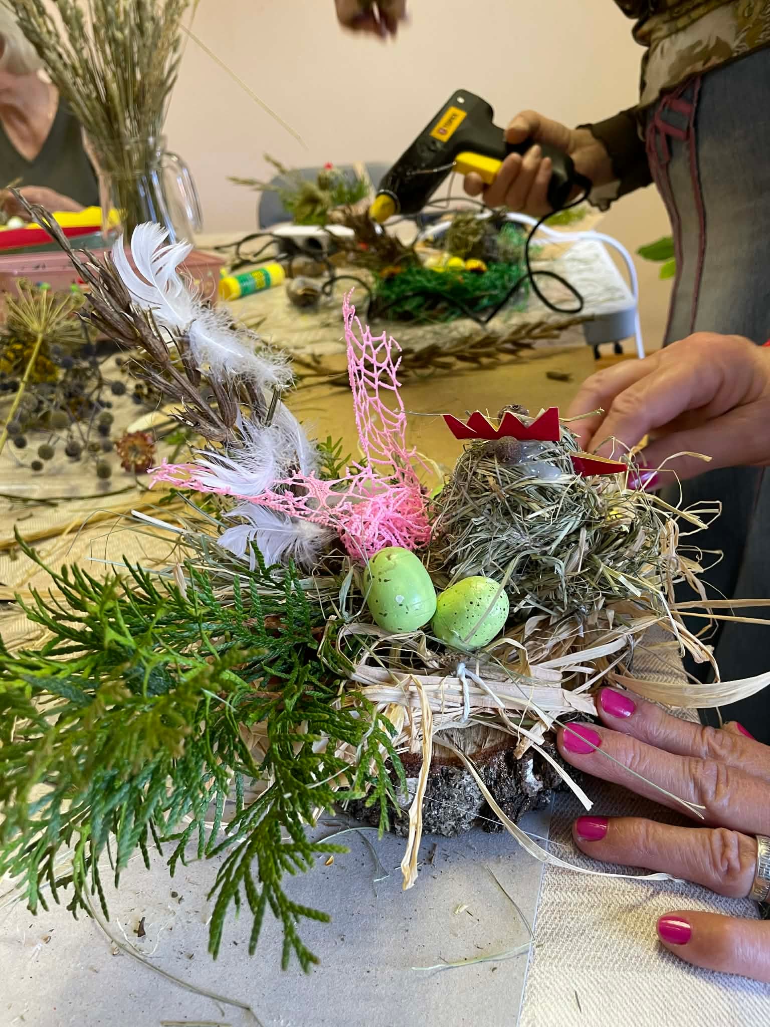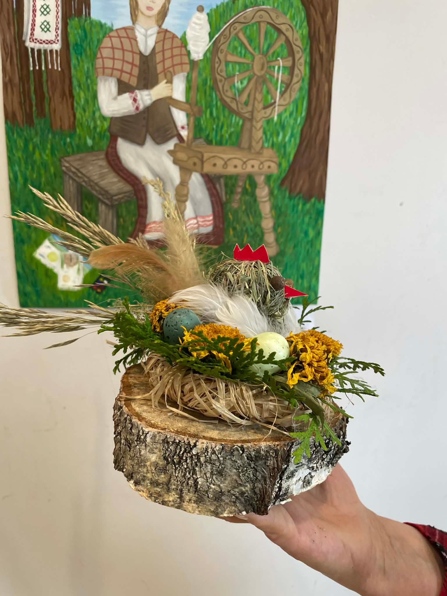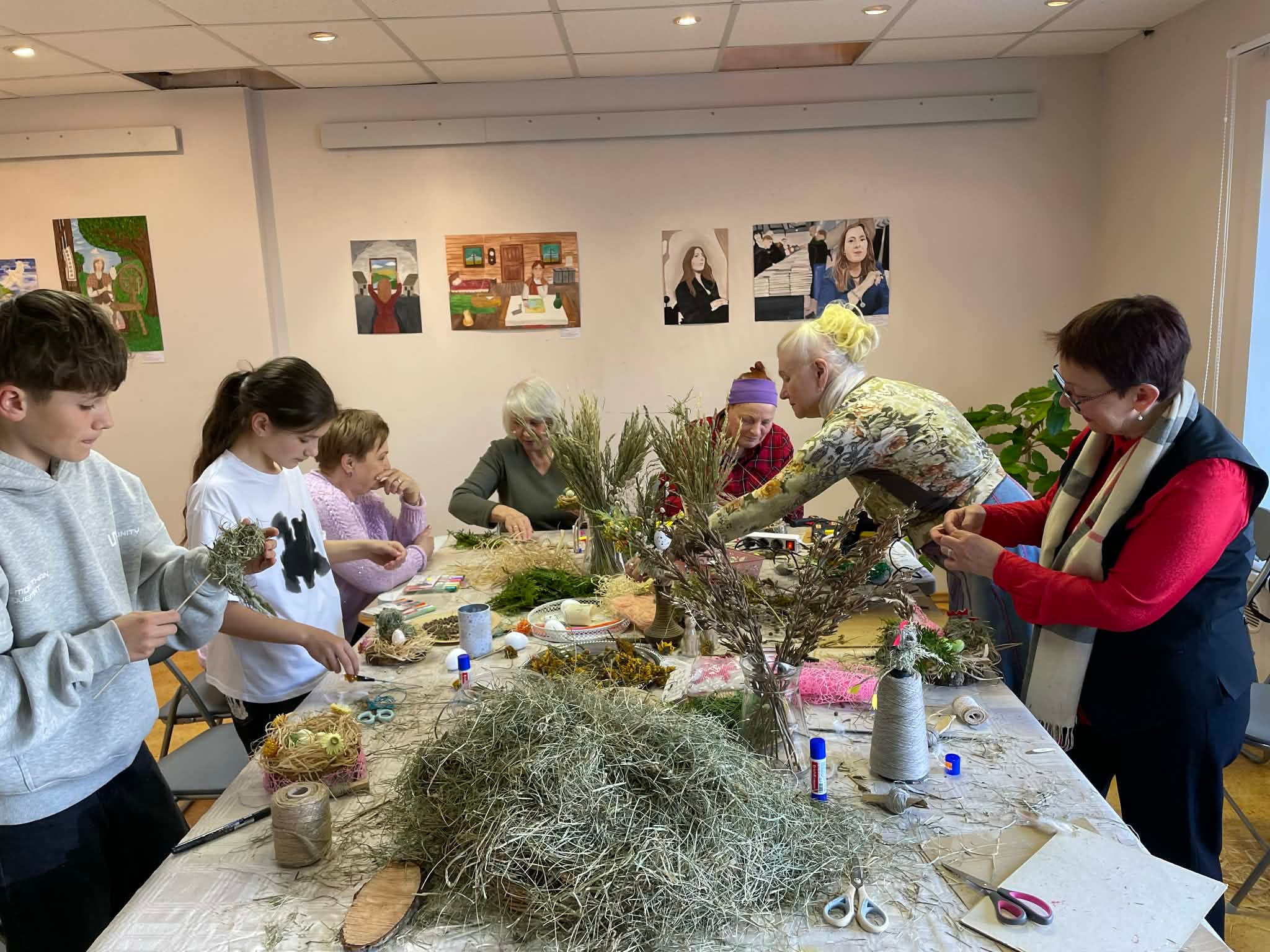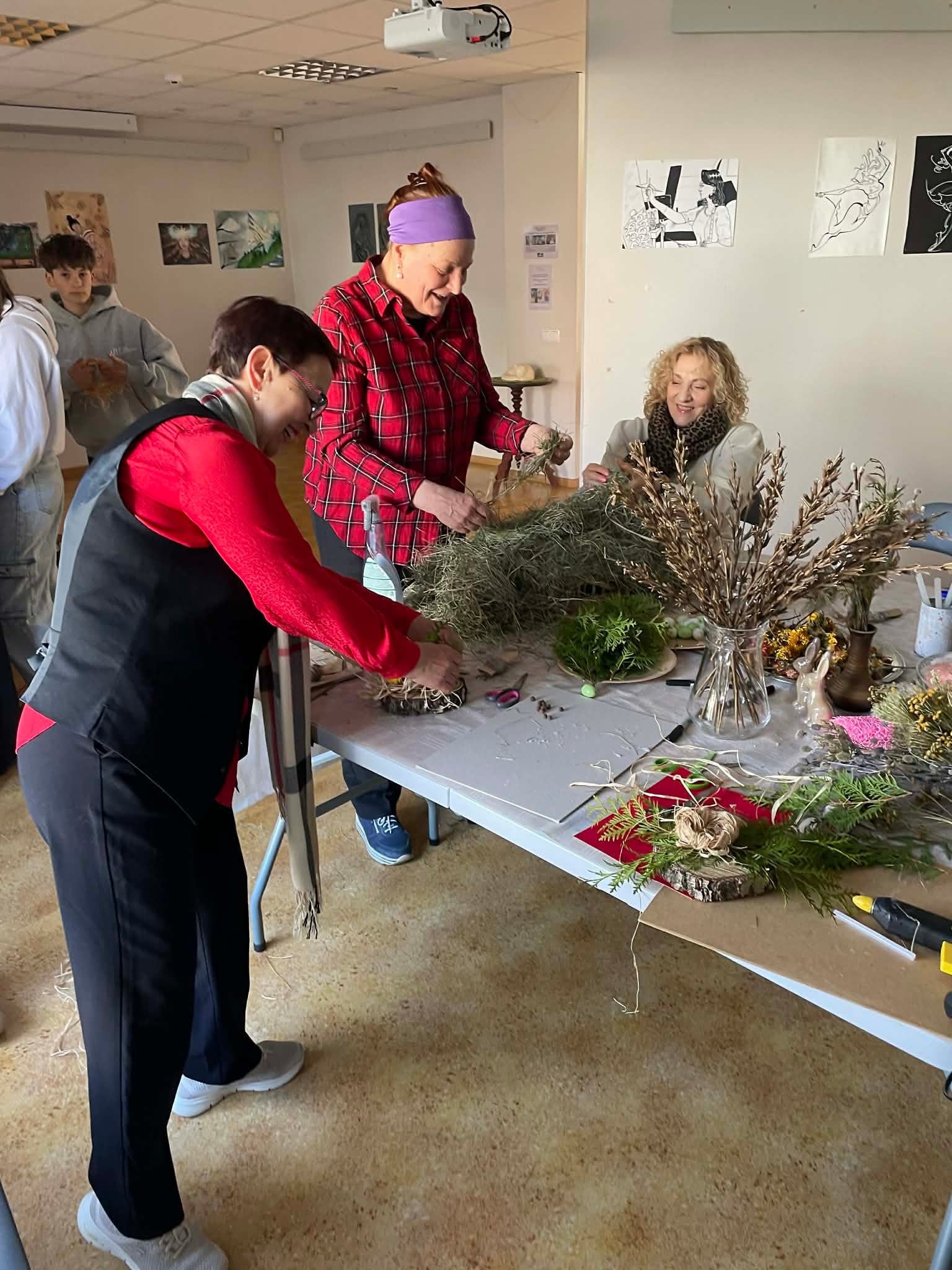 Užsiėmimo metu susirinkusieji kūrė šventinę dekoraciją, naudodami gamtines medžiagas ir įvairias priemones. Kūryba įtraukė, skatino bendravimą, dalijimąsi idėjomis ir leido atsiskleisti kiekvieno dalyvio individualumui.